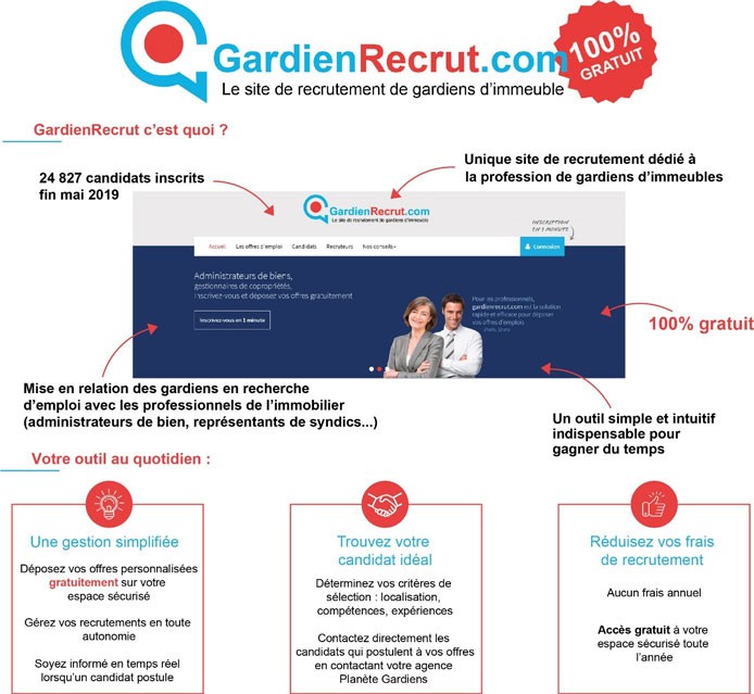 Enseigne de franchise spécialisée dans les prestations de services à destination des gestionnaires de copropriétés (entretien d’immeuble, confort des résidents, aide au recrutement de gardiens…), le réseau Planete Gardiens avait noué un partenariat avec la plateforme GardienRecrut.com, qui vient d’atteindre les 25 000 candidats inscrits. GardienRecrut, une plateforme qui valorise la profession de gardien d’immeuble Unique site de recrutement de la profession de gardien d’immeuble, la plateforme GardienRecrut.com, dévoilée il y a cinq ans, a récemment atteint la barre des 25 000 candidats inscrits. En effet, le partenaire de l’enseigne Planete Gardiens, qui met en relation les gardiens en recherche d’emploi et les recruteurs facilement et gratuitement, connait un vif succès depuis son lancement officiel, et a réussi à séduire de nombreux utilisateurs grâce notamment à sa fonction de critères de sélection, qui rend les recherches d’emplois et les recrutements très faciles. Le site connaît une autre avancée majeure avec sa présence sur différents réseaux sociaux (LinkedIn, Viadéo et Facebook). Avec des publications sur les actualités de la plateforme et sur le secteur d’actualité, GardienRecrut valorise la profession de gardien d’immeuble. Un savoir-faire éprouvé depuis 25 ans Fort d’un concept unique qui apporte des solutions aux gestionnaires de copropriétés et aux résidents d’immeubles confrontés à l’absence temporaire ou définitive de leur gardien (congés, absences imprévues, départs à la retraite…), le réseau Planete Gardiens, qui a été fondé en 1997, et lancé en franchise en 2015, continue de recruter actuellement de nouveaux porteurs de projet dotés d’un esprit d’entrepreneur, d’un goût prononcé pour les relations humaines, d’un sens du service, d’une capacité à manager une équipe, ainsi que d’un esprit d’entrepreneur. Pour permettre à chaque nouvel affilié de connaitre le succès dès le lancement de son activité, le réseau offre à ces derniers l’opportunité de bénéficier d’une formation initiale (10 jours de formation théorique, 5 jours de mise en pratique et parcours métier au sein de l’unité pilote), ainsi que d’une assistance continue tout le long du contrat de franchise. >> Lire aussi : Planète Gardiens : « Pour devenir franchiseur, il faut d’abord être prêt, apprendre le métier et se doter des outils nécessaires »