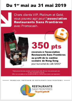 Pour chaque achat de café SAXO, Promocash reversera 350 points à l’association pour la création de la cantine scolaire. Lebonus en points sur les achats des clients Promocash - quel que soit leur statut VIP, Platinum ou Gold - sera ensuite converti en don en numéraire pour soutenir le projet.