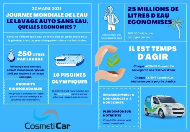 A l’occasion de la journée mondiale de l’eau, CosmétiCar publie une série de chiffres qui donne à réfléchir sur la consommation d’eau. Le réseau de franchise spécialisé dans le lavage auto sans eau annonce en effet une économie de 250 litres d’eau par véhicule lavé !