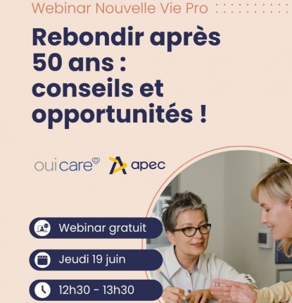 Pour accompagner les plus de 50 ans dans cette démarche, le groupe Oui Care, en partenariat avec Nouvelle Vie Professionnelle et l’APEC, propose, jeudi 19 juin à 12h30, un webinaire exclusif, Rebondir après 50 ans : conseils et opportunités .