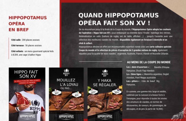 Pour célébrer la réouverture du restaurant et jusqu’à la finale de la Coupe du monde, Hippopotamus Opéra se pare des couleurs de l’équipe de France de rugby pour une opération commerciale intitulée “Hippo fait son XV”. Les vitrines se parent d’habillages rugby, la salle s’anime avec des ballons de rugby, des sets de table et des affiches dédiées à l’équipe. La carte spéciale Coupe du monde suit le mouvement avec une sélection de viandes de qualité du monde entier, provenant de cinq grandes nations du rugby, réputées également pour la qualité de leurs viandes : Argentine, Australie, France, Irlande et Nouvelle-Zélande.