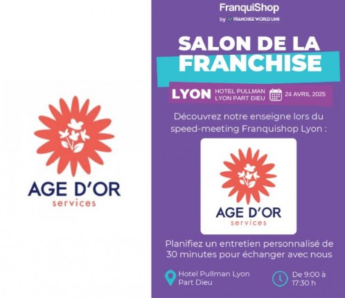 Acteur historique de l’aide à domicile depuis plus de 30 ans, Âge d’Or Services donne rendez-vous aux porteurs de projet lors du salon Franqui Shop 2025 à Lyon. Sur place, les visiteurs pourront rencontrer l’équipe du réseau, découvrir les opportunités de franchise et poser toutes leurs questions. Une occasion privilégiée d’échanger en direct avec les représentants de l’enseigne et d’envisager un projet entrepreneurial porteur de sens, dans un secteur en pleine croissance.