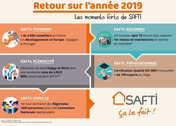 En termes de notoriété ensuite. Tout au long de l’année, le réseau a effectué des campagnes de publicité à la télévision qui lui ont permis d’accroitre considérablement sa notoriété. Aujourd’hui, selon un sondage effectué par l’IFOP en septembre 2019, SAFTI est le réseau de mandataires en immobilier numéro 1 en notoriété, en France.