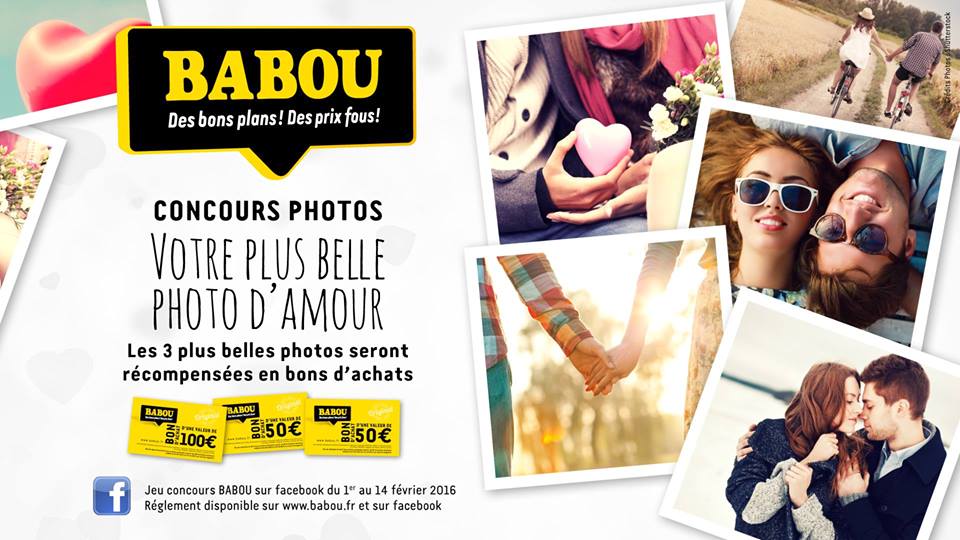Depuis le 1er février et jusqu’au 14, le réseau vous invite à vous rendre sur sa page Facebook pour participer à ce concours qui met en jeu jusqu’à 100€ de bons d’achat valables dans ses magasins. Pour tenter votre chance, il suffit de poster “votre plus belle photo d’amour”, que ce soit avec votre amoureux(se), votre meilleur(e) ami(e), votre famille… Le jury de Babou choisira trois photos gagnantes, celles qui représentent pour lui un véritable moment d’émotion. Dépêchez-vous, il ne vous reste que quelques jours pour participer !