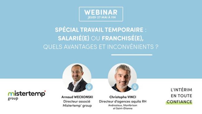 Mistertemp’ group, spécialiste du recrutement et du travail temporaire avec ses trois réseaux, aquila RH, Lynx RH et Vitalis Médical, organise un webinar autour des avantages et des inconvénients à se lancer en franchise sur ce marché.