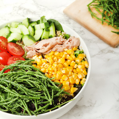 Fidèle à sa démarche éco-responsable consistant à proposer des produits locaux à ses clients soucieux de mieux manger, la franchise Jour healthy by nature, a trouvé, pour intégrer cette nouvelle plante tendance à son catalogue, des producteurs français de salicorne. Ainsi, toute la salicorne distribuée dans les restaurants Jour est récoltée dans les prés salés du Touquet. Riche en minéraux, en bêtacarotène et en fibre, coupe-faim et pourtant très faiblement calorique, la salicorne est LA plante tendance pour des repas healthy et diététiques. En outre, elle se marie à merveille à du quinoa (d’Anjou, évidemment), du maïs doux, du thon et quelques concombres, pour une salade toute en fraîcheur et en saveurs estivales.Un nouveau produit pour les franchisés Jour !