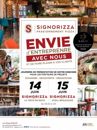 Désireux de conquérir de nouveaux territoires en France, le réseau est actuellement à la recherche de nouveaux acteurs prêts à entreprendre à ses côtés. Ainsi, le 14 juin 2022 de 10h30 à 15h à La Teste-de-Buch, 33260, et le 15 juin 2022 de 10h30 à 15h à Beaucouze (CC ATOLL 49100), l’enseigne organise des réunions d’information. Une belle opportunité pour découvrir l’enseigne SIGNORIZZA, comprendre son positionnement, déguster les produits et surtout obtenir toutes les réponses aux questions que vous vous posez.