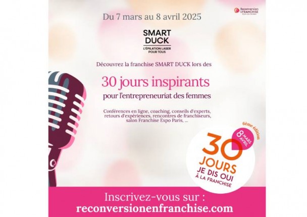 Chaque année, à l’occasion de la journée internationale des droits des femmes, Reconversionenfranchise.com lance son initiative “30 jours, je dis oui à la franchise”. L’édition de cette année se concentre sur le développement du leadership au féminin. Du 7 mars au 8 avril, un programme riche en conférences et ateliers est proposé pour encourager les femmes à se lancer dans l’entrepreneuriat en franchise.