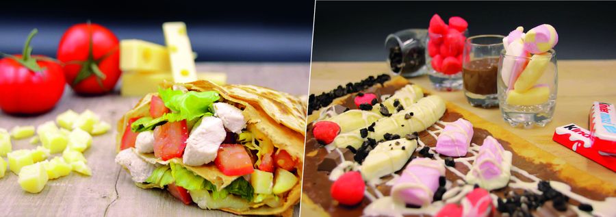 Concept de crêpes gourmandes sucrées et salées à déguster à emporter.