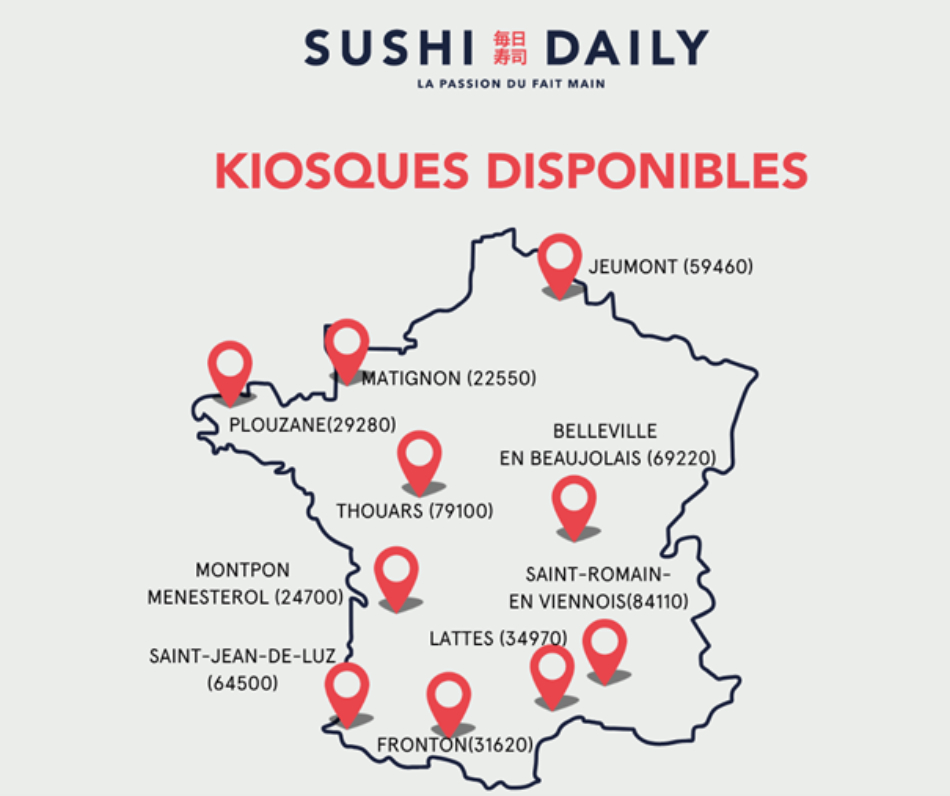 Sushi Daily propose actuellement plusieurs opportunités de reprise dans différentes régions françaises. Ces kiosques à fort potentiel représentent une occasion unique pour les entrepreneurs souhaitant rejoindre un réseau reconnu dans la restauration japonaise.