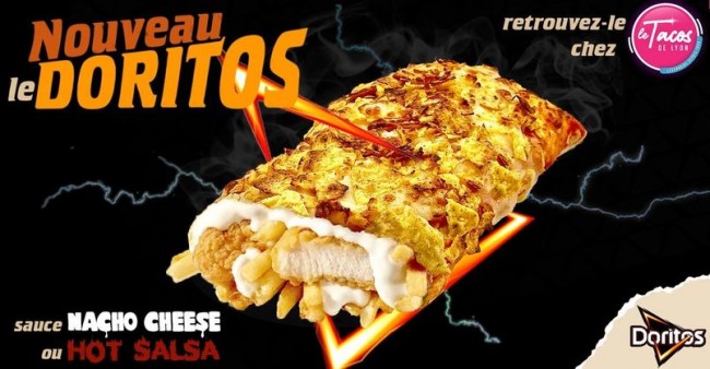 Ce Tacos baptisé Le Doritos peut être garni, au choix, de sauce Nacho Cheese ou de sauce Hot Salsa en fonction des goûts de chacun. La présence des célèbres triangles au fromage garanti une sensation inimitable sur le tacos.