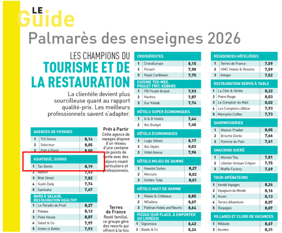 taobento vient d’être distinguée par les consommateurs français ! L’enseigne décroche la première place du palmarès Capital–Statista 2026 dans la catégorie Restauration asiatique & sushis, avec une note de 8,19/10.