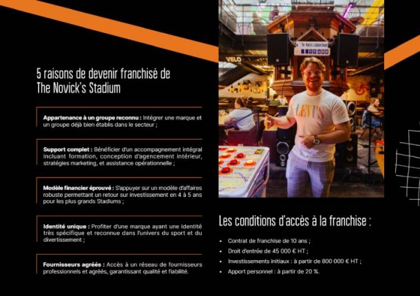 The Novick’s Stadium : un lieu de vie incontournable pour les passionnés de sport, de jeux et de soirées entre amis La Maison Novick ne cesse de surprendre avec ses concepts innovants et The Novick’s Stadium ne fait pas exception. Depuis son ouverture en 2018 sur les quais de Seine à Rouen, ce bar sportif a su s’imposer comme un lieu de rencontre incontournable. Offrant bien plus que des retransmissions sportives, The Novick’s Stadium propose une ambiance festive et conviviale, où chaque détail est pensé pour séduire les passionnés de sport, les amateurs de jeux, et ceux qui recherchent des soirées mémorables entre amis. L’établissement offre une expérience unique avec une journée rythmée par divers événements : le Campus 14h-18 (idéal pour venir entre amis ou en famille pour jouer au babyfoot, savourer un café et déguster de délicieuses crêpes avant la soirée), l’Afterwork 18h-20h (une pause détente avec une bonne bière au BeerWall accompagnée d’une planche de fromages locaux), le Half-Time 20h-22h (célébrez une victoire avec un bon burger tout en discutant des pronostics), et enfin le DJ Set 22h-02h : les lumières s’abaissent, le Dancefloor s’anime au son envoûtant du DJ résident et du barman. C’est particulièrement cette combinaison d’offres diversifiées et d’une atmosphère chaleureuse qui a permis à The Novick’s Stadium de devenir un véritable phare de la vie nocturne locale en moins de deux ans. The Novick’s Stadium : un tremplin pour les entrepreneurs Face à un engouement croissant pour l’entrepreneuriat, The Novick’s Stadium offre une opportunité exceptionnelle pour ceux qui souhaitent se lancer dans l’entrepreneuriat en franchise. Intégrer ce réseau garantit non seulement le soutien d’une marque solide, mais aussi l’accès à un modèle commercial éprouvé, une identité distinctive, et des fournisseurs agréés. Le groupe Novick, avec ses 8 établissements en Normandie, se distingue par son engagement qualité et une vision claire : créer des lieux de vie uniques et conviviaux. De la pizzeria Henri IV au Bar O Mètre, chaque adresse est un concept à part entière, conçu pour offrir des expériences gastronomiques et ambiances variées. L’excellence, l’audace, la passion et la proximité sont les principales valeurs du réseau. The Novick’s Stadium : des conditions d’accès attractives Les conditions d’accès à la franchise The Novick’s Stadium sont particulièrement attrayantes : un contrat de franchise de 10 ans, un droit d’entrée de 45 000 € HT, et des investissements initiaux à partir de 800 000 € HT, avec un apport personnel de 20 %. De plus, les futurs franchisés bénéficieront d’un accompagnement complet incluent assistance opérationnelle, stratégies marketing, conception d’agencement intérieur, et formation. Avec le lancement de The Novick’s Stadium, La Maison Novick invite les entrepreneurs et porteurs de projets à devenir les champions de ce concept innovant, prêt à conquérir les centres-villes avec le nouveau format Stadium City. >> Lire aussi : THE NOVICK’S STADIUM : la franchise qui fait marquer des points aux entrepreneurs