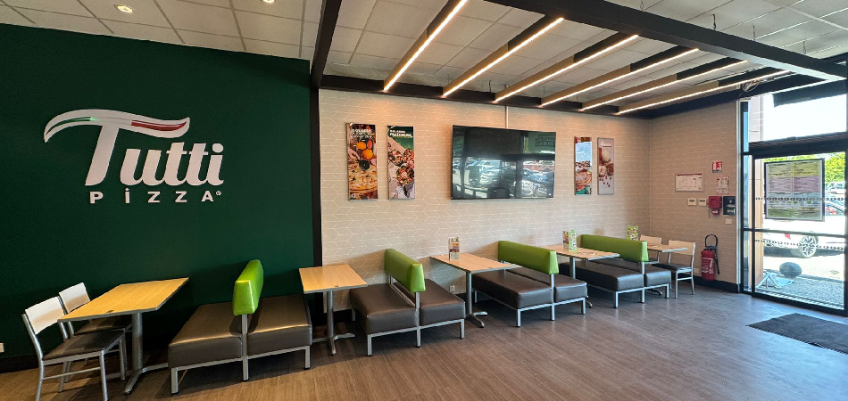 Entièrement réaménagé pour refléter l’identité visuelle de la marque, le restaurant s’étend sur 200 m² et compte 50 places assises. L’espace a été conçu pour fluidifier le parcours client grâce à des bornes de commande et à l’intégration de QR codes directement sur les tables. L’objectif est clair : permettre un accès simple et rapide aux recettes Tutti Pizza, en salle comme en vente à emporter.