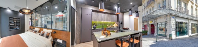 Enseigne d’agencement et de décoration d’intérieurs adossée à une offre de cuisine, salle de bains, dressing, living, et agencement sur-mesure.
