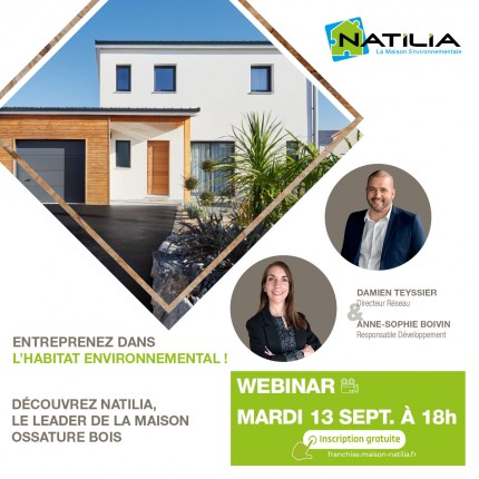 Marché, réseau, concept, perspectives… Pour tout savoir sur le réseau Natilia et ses opportunités d’affaires, inscrivez-vous et participez au webinaire découverte Natilia. Pendant une heure, Anne-Sophie Boivin, responsable développement réseaux, et Damien Teyssier, directeur réseau, prendront la parole pour présenter Natilia, le 1er réseau de constructeurs Maison Ossature Bois en France.